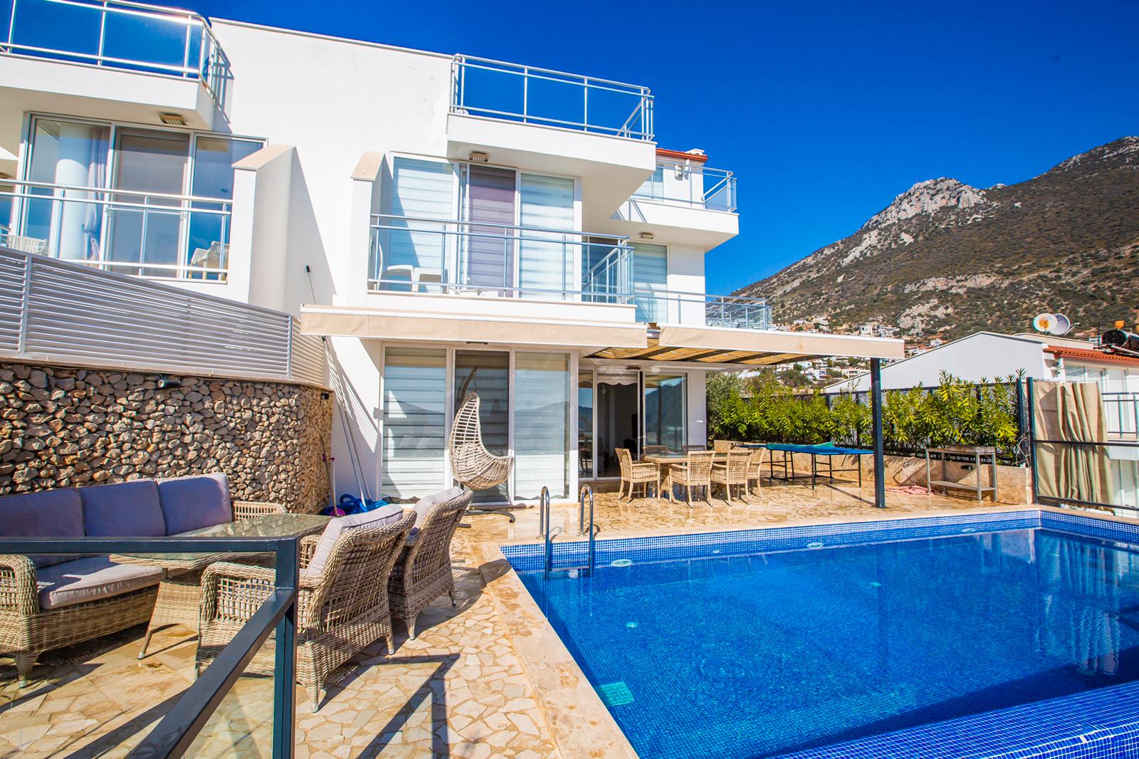 Panoramic Sea Views: Enjoy uninterrupted vistas over the Mediterranean Sea and the stunning Kalkan coastline from multiple levels, including the pool terrace and master bedroom.
