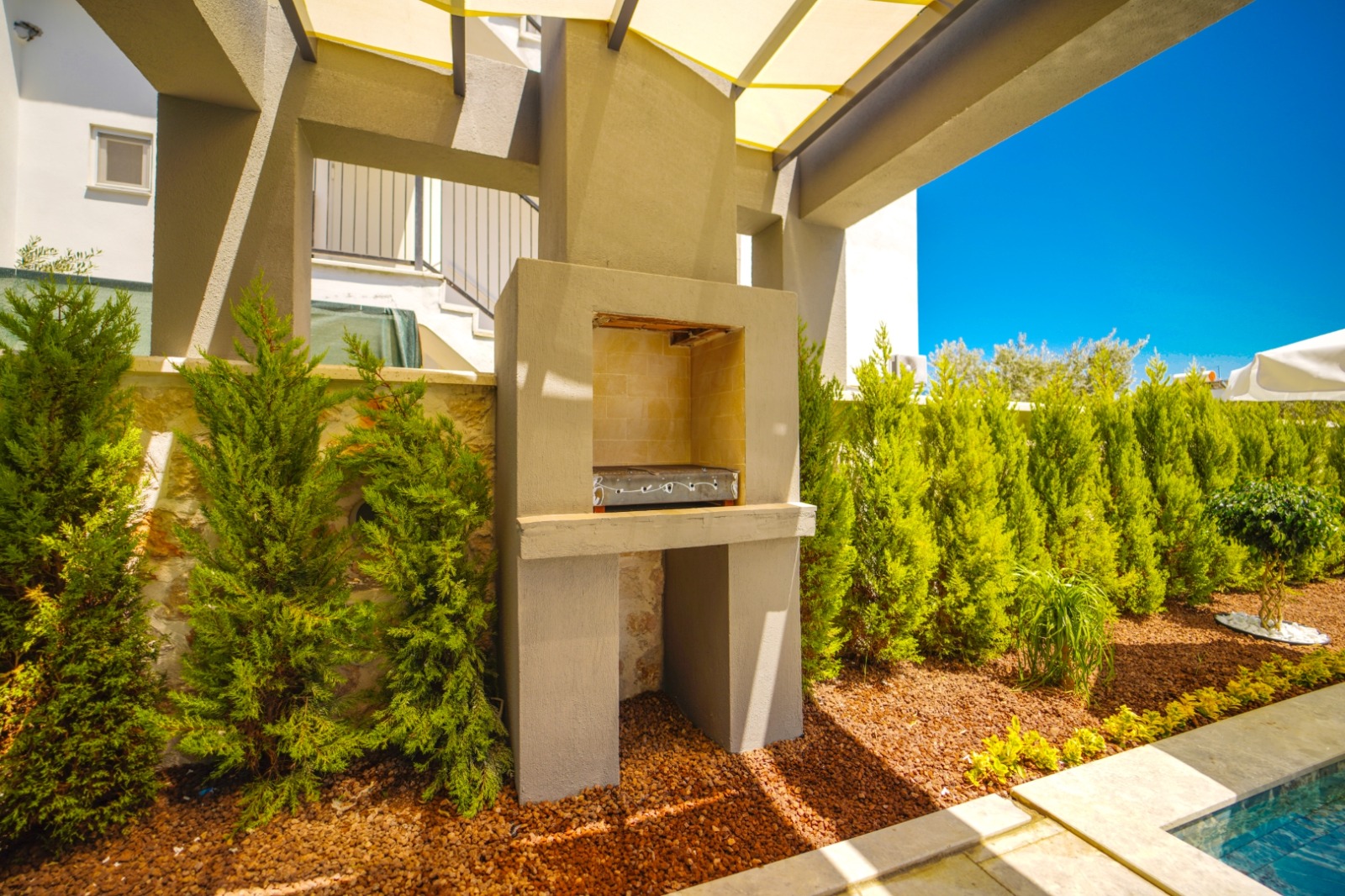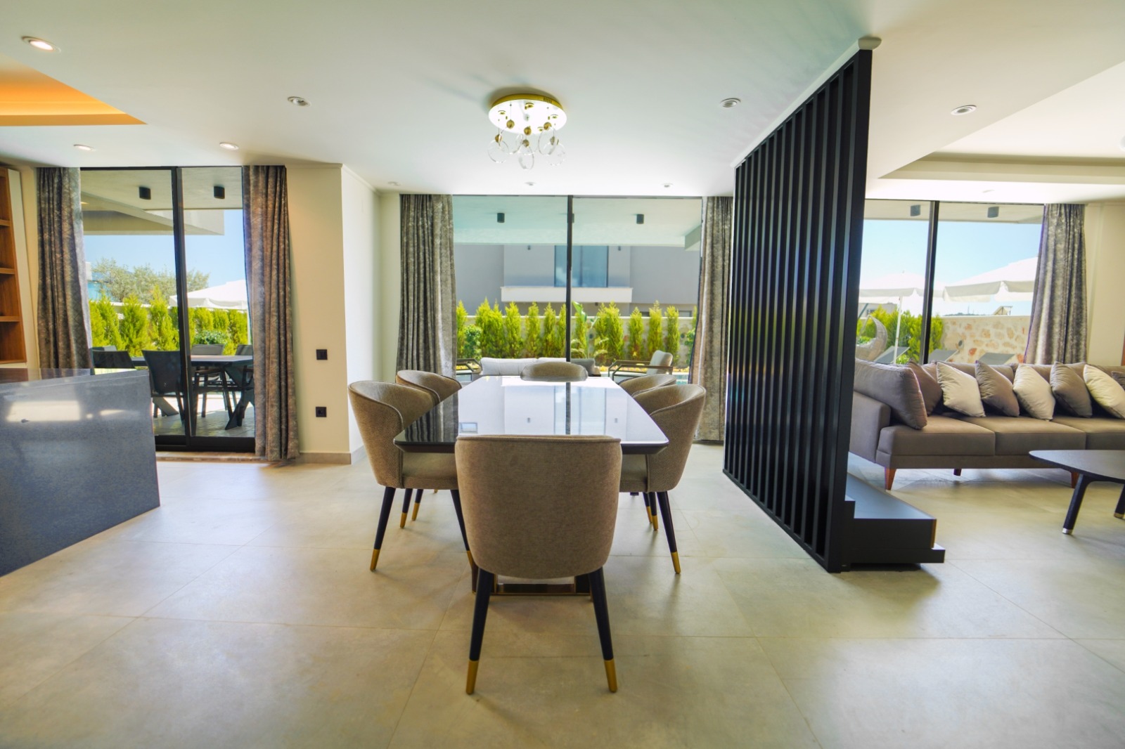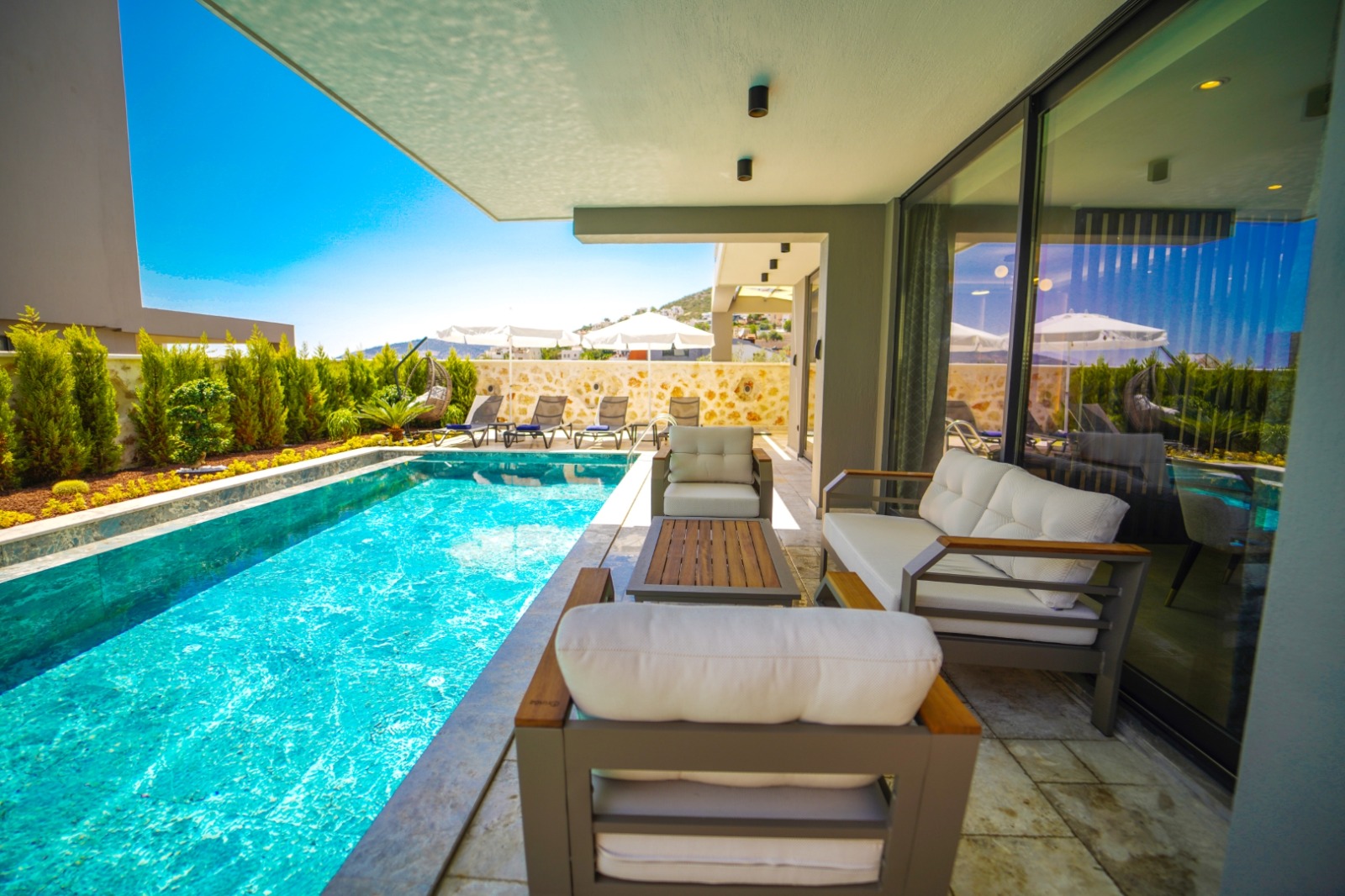 The outdoor spaces are designed as a natural extension of the luxurious interior, tailored for the Mediterranean lifestyle.