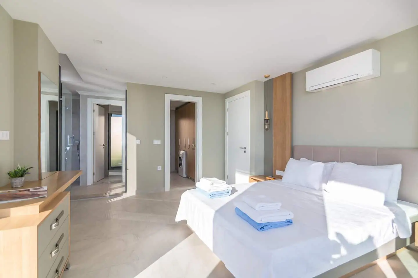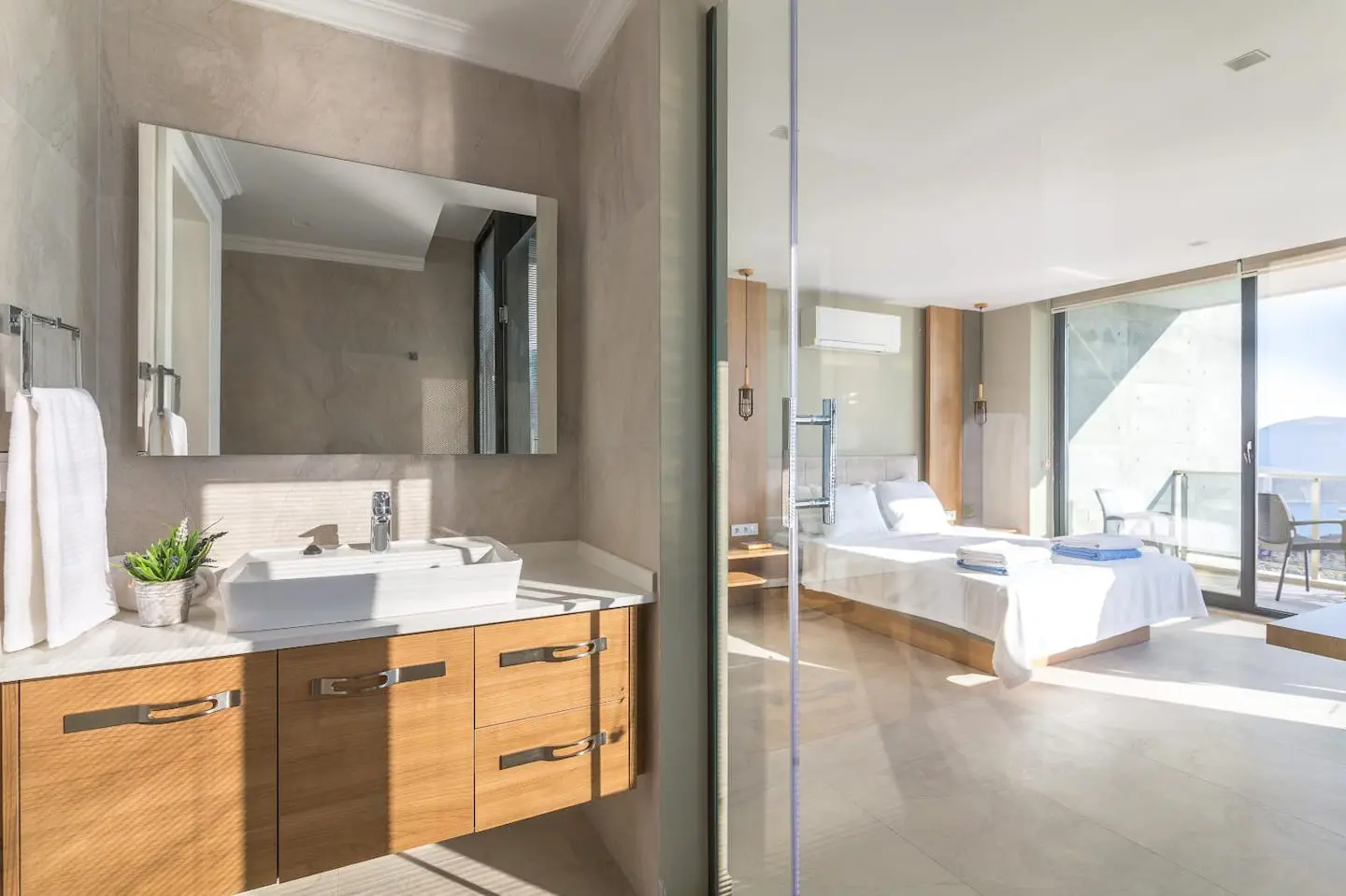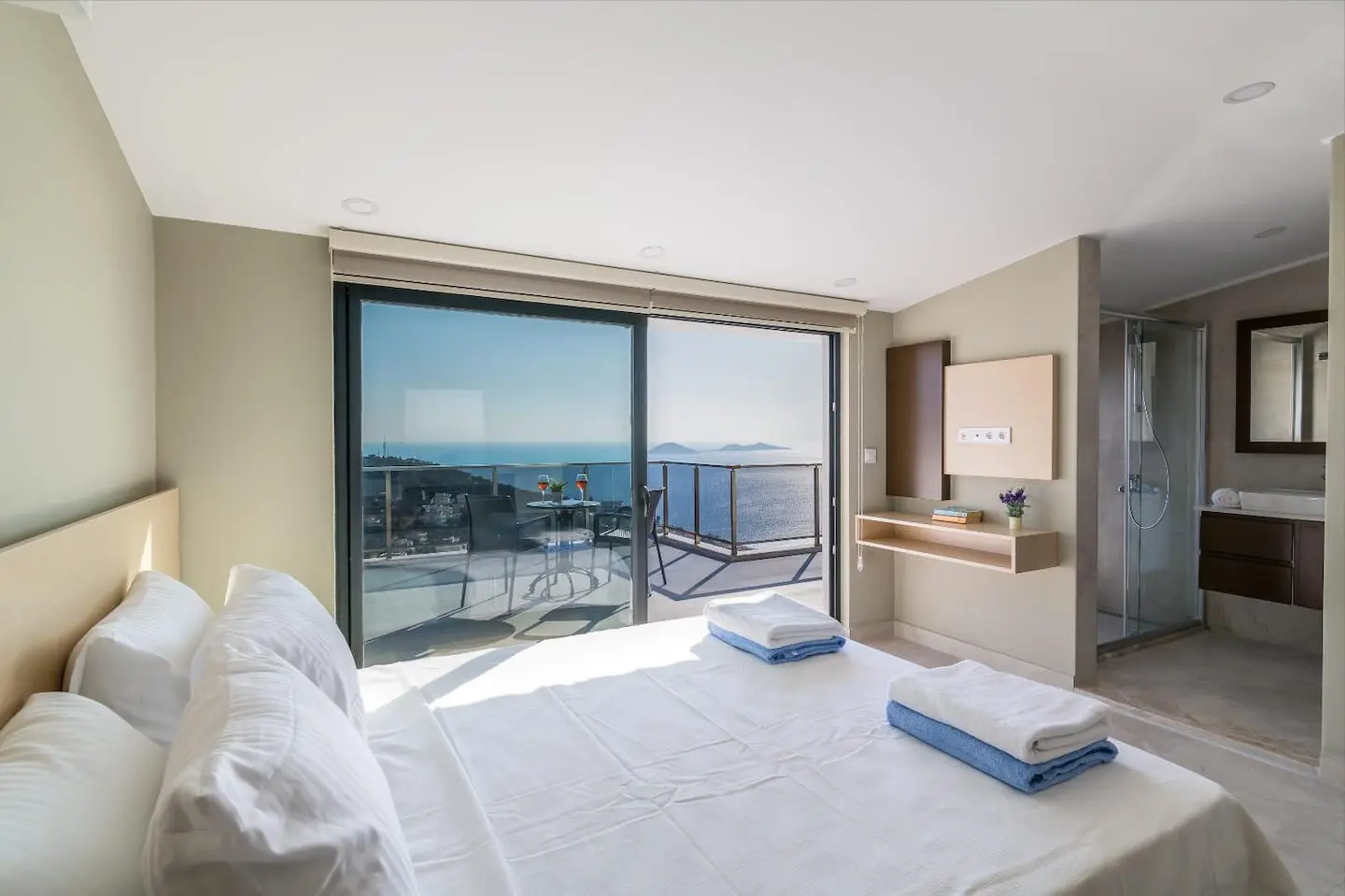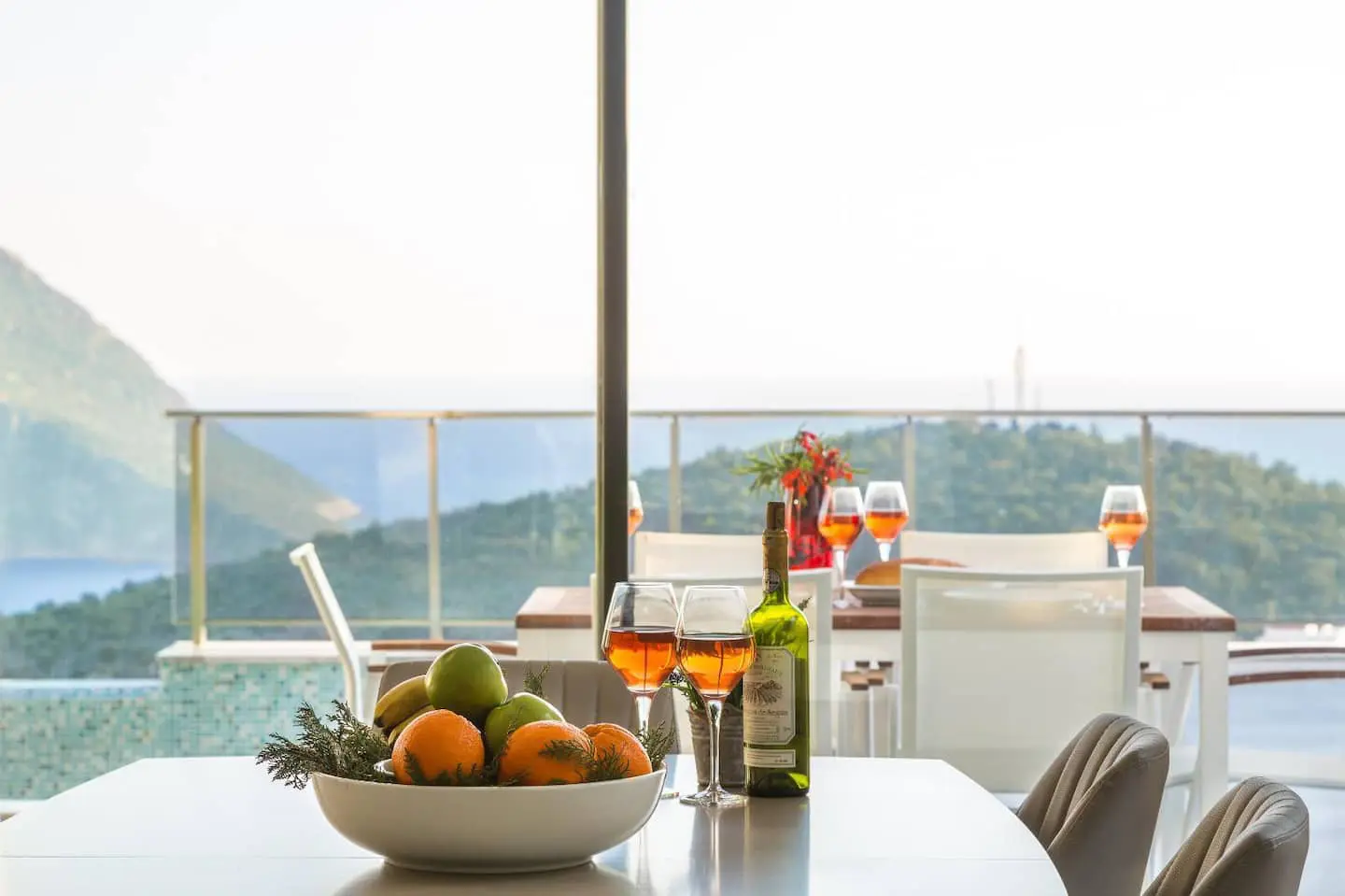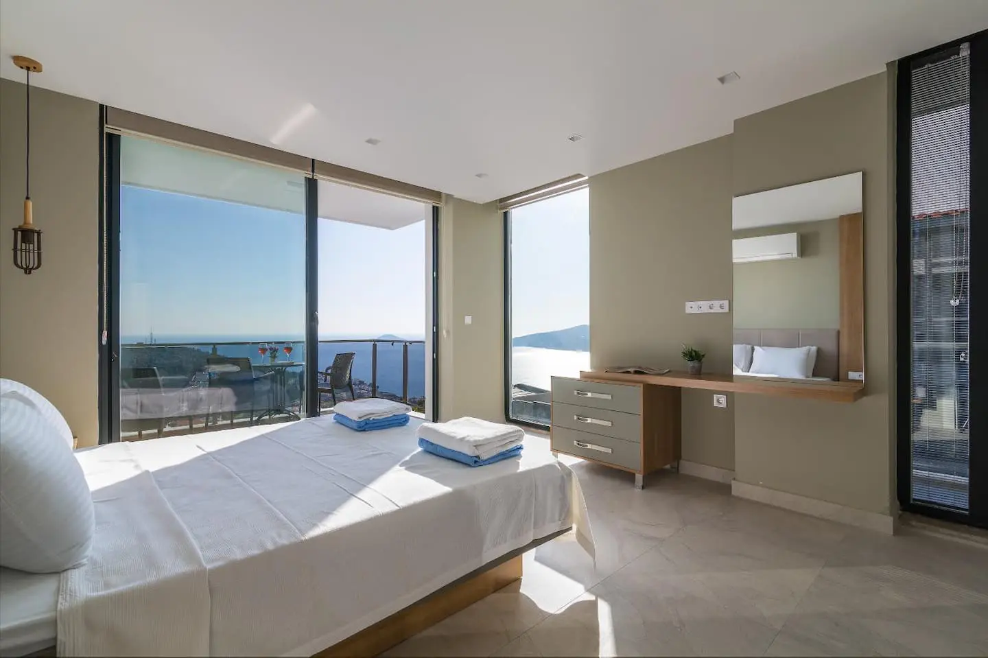 The highlight of this villa is its private infinity pool overlooking the turquoise waters of Kalkan Bay. The pool terrace provides ample space for lounging, dining, or entertaining guests. The rooftop terrace extends the outdoor experience, offering panoramic sea and mountain views. Whether it’s a morning coffee or an evening cocktail, this space creates unforgettable moments.